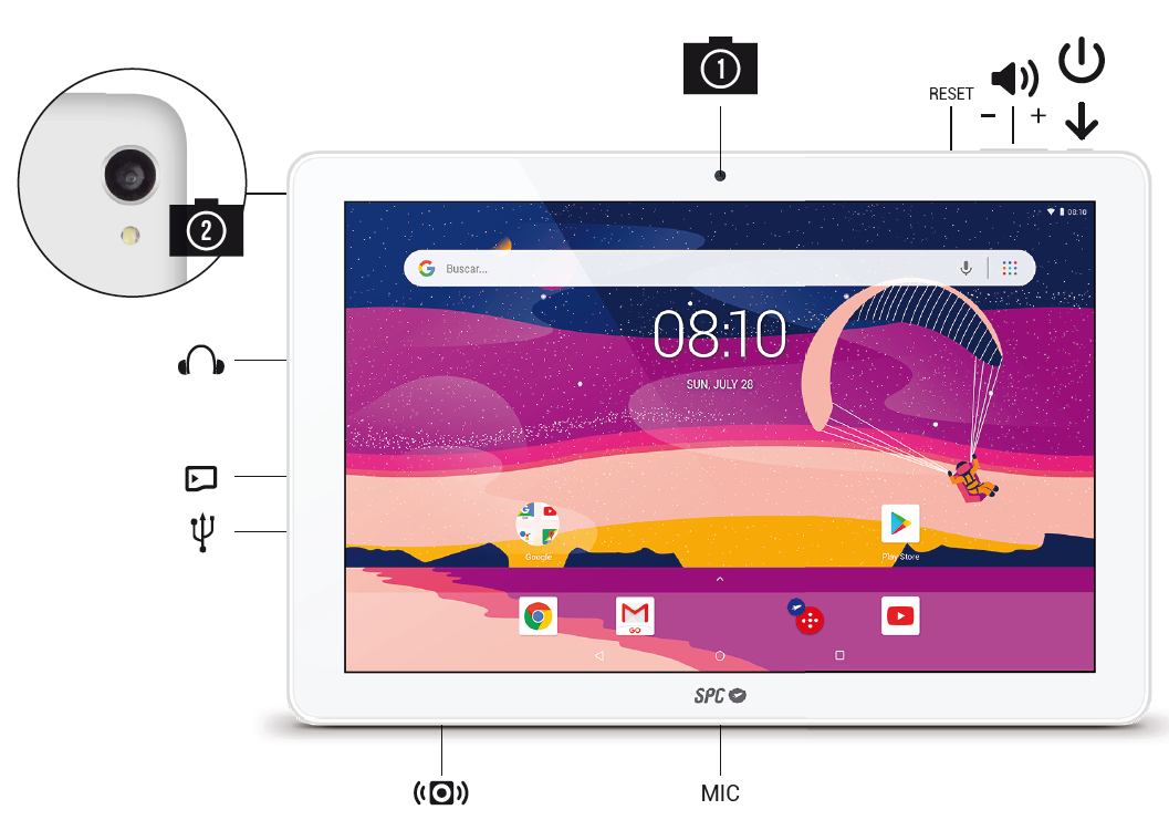 Tu GRAVITY cuenta con multitud de conexiones y accesorios, como 2 cámaras, una de ellas con flash, un altavoz, micrófono, conexión para auriculares, un slot para tarjetas de memoria y controles de volumen. En la imagen inferior, puedes comprobar la localización de todos ellos: