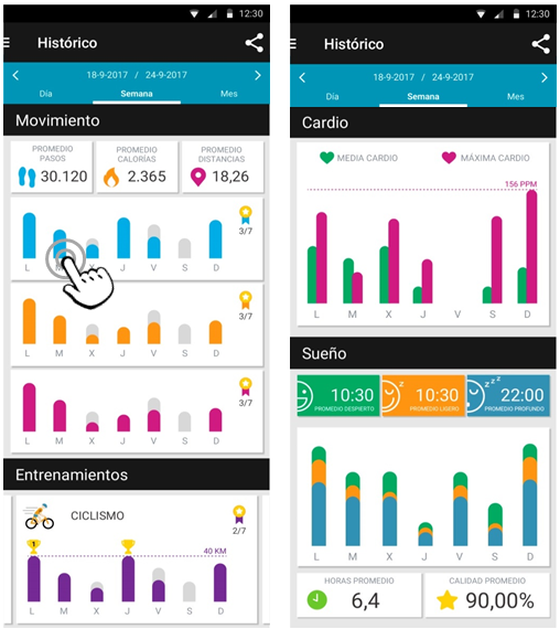 Todas las barras son navegables, por lo que pinchando en una de ellas, verás directamente el resumen completo de ese día. No te pierdas nada de tus avances.