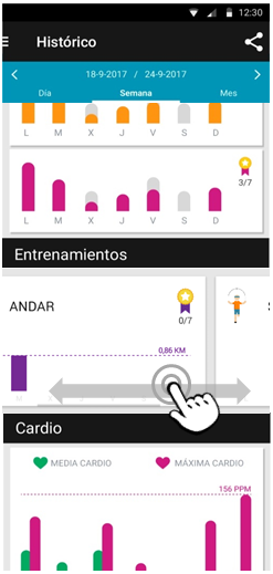 En el caso de los entrenamientos en vista semanal, si has realizado más de un deporte distinto esa semana, podrás verlos todos desplazando el dedo de derecha a izquierda, como se indica en la imagen.
