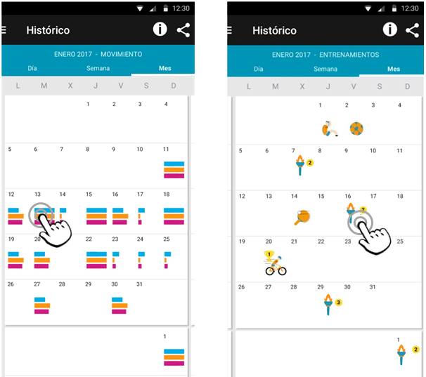 Pero además, desplazando el calendario de derecha a izquierda, Smartee muestra el histórico mensual de los deportes practicados (siempre que el dispositivo cuente con esta funcionalidad). De esta forma, cada día puedes ver qué deportes has practicado, cuántas sesiones, y en el caso de la antorcha olímpica, se indica que eres una máquina, y has hecho varios deportes distintos.