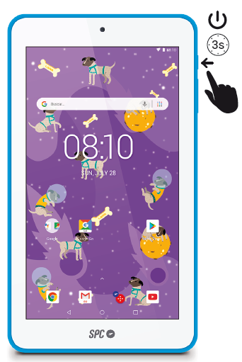 Para encender tu LAIKA, por favor, pulsa durante 3 segundos en la tecla de encendido que encontrarás en la parte superior derecha de la tablet.