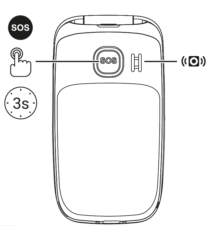 Durante una emergencia, mantén pulsada la tecla SOS durante unos segundos. El terminal emitirá un sonido de alerta (bocina) (si está configurado) y se iniciará el ciclo de llamadas. El teléfono activará el altavoz manos libres y llamará a los números SOS en orden consecutivo, enviando también el mensaje SOS mediante SMS (si esta activado el Envío SMS). Si no hay respuesta, saltará al siguiente número hasta que uno de ellos responda, este ciclo se repetirá 3 veces.