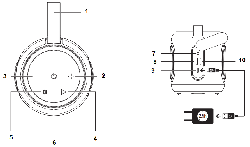 - Selección de modo luminoso: Pulsando sucesivamente este botón puedes cambiar el modo de iluminación del altavoz. El altavoz SPC ORBITAL SPARK tiene dos zonas de iluminación, alrededor de las membranas que realzan los sonidos bajos y seis secuencias diferentes de animación luminosa. Puedes cambiar de una secuencia a otra para elegir la que más te guste o adapte a la música que estás escuchando. Para ello pulsa brevemente el botón 5. Y si deseas apagar completamente la iluminación, haz pulsación larga sobre este botón.