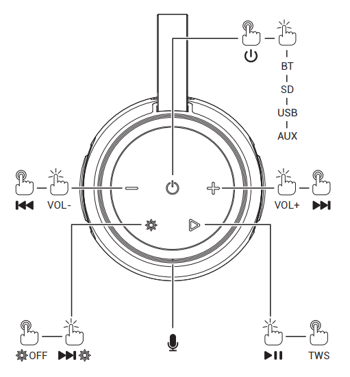 - Botón de encendido y apagado del dispositivo. Mantén pulsado para encender o apagar tu SPC ORBITAL SPARK. Con pulsación corta para conmutar de BT a SD, USB o AUX. Dispone de indicación luminosa de enlace BT (Bluetooth): Cuando no hay dispositivo conectado en BT, parpadea en azul. Cuando hay conectado un dispositivo, se mantiene en azul fijo.