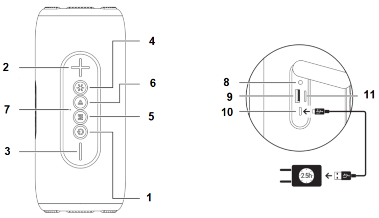 - USB C para carga. Conecta el cable USB a un cargador o puerto de carga. A su lado hay un indicador LED de carga: Durante la carga está encendido, y apagado al completarse la carga.