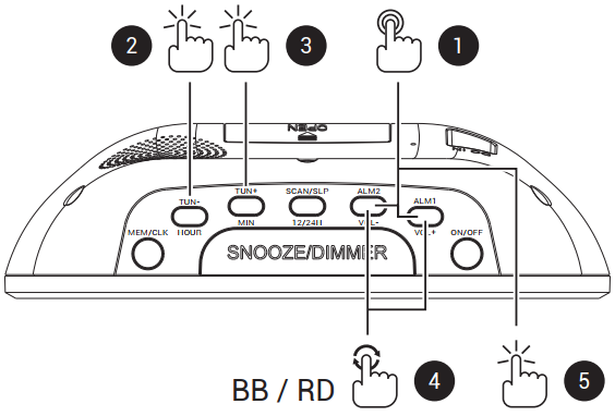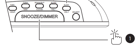 - Pulsa la tecla HOUR/TUN- para establecer la hora de la alarma.