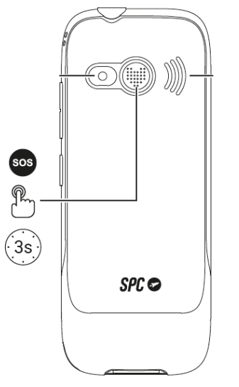 Durante una emergencia, mantén pulsada la tecla SOS durante unos segundos. El terminal emitirá un sonido de alerta (bocina) (si está configurado), la linterna parpadeará y se iniciará el ciclo de llamadas. El teléfono activará el altavoz manos libres y llamará a los números SOS en orden consecutivo, enviando también el mensaje SOS mediante SMS (si esta activado el Envío SMS). Si no hay respuesta, saltará al siguiente número hasta que uno de ellos responda, este ciclo se repetirá 3 veces.
