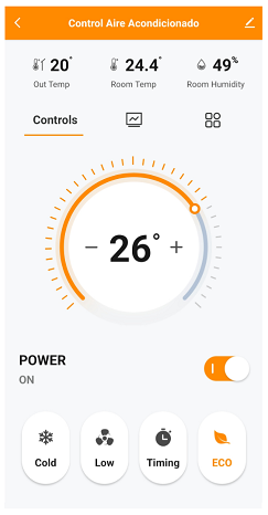 - Depuis l'application : Dans la partie centrale du panneau de contrôle, nous avons une demi-sphère, à partir de là nous contrôlerons la température en faisant glisser le point ou en cliquant sur les icônes "+" et "-".