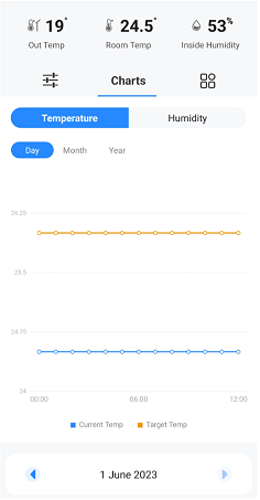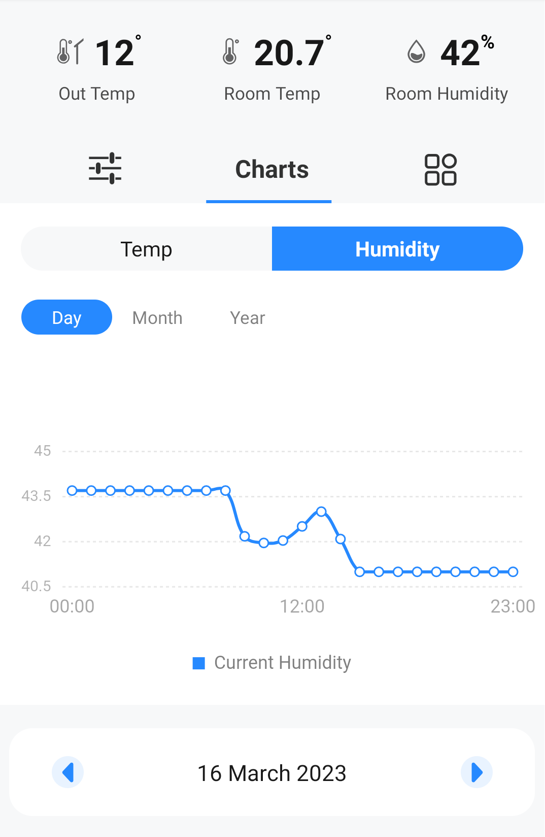 Dans la partie centrale, entre "Paramètres" et "Contrôles", nous trouverons le bouton "Historique", une fois que vous appuyez dessus, vous verrez les données de température et d’humidité depuis le premier jour où l’appareil a été connecté à travers une série de graphiques.