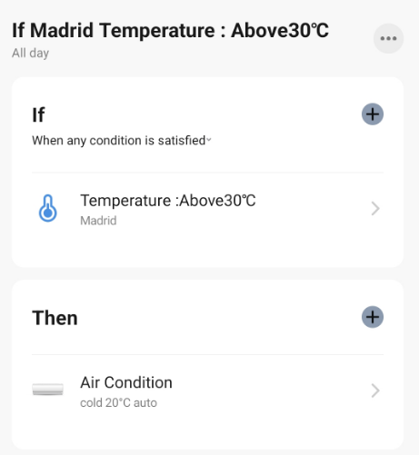 Exemple : Si la température à Madrid est supérieure à 30 °C, allumez le climatiseur à 20 °C en mode Froid, Vitesse automatique.