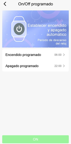 Par défaut, cette fonction est désactivée. Pour l'activer, définissez l'heure et les minutes de l'allumage et de l'extinction, et appuyez sur le bouton ON en bas.
