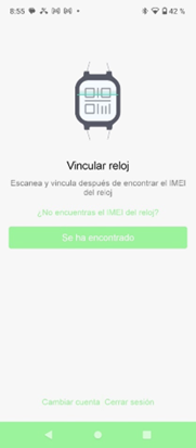 - Ensuite, un écran apparaîtra, indiquant comment trouver le code associé à l'IMEI de la montre, nécessaire pour le lier. Après l'affichage le code QR de la montre, sélectionnez "Trouvé", la caméra sera ouverte pour que vous puissiez le scanner. Si le QR n'est pas détecté, il est possible de saisir le code manuellement, c'est un code de 10 chiffres et caractères.