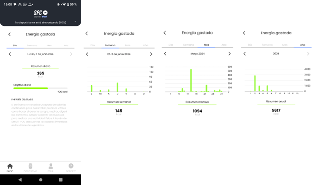 Les informations sont présentées sous forme de barres verticales, pour vérifier d'un coup d'œil l'énergie brûlée dans chaque période de temps. Toutes les barres sont navigables, en appuyant sur l'une d'elles, vous verrez directement la valeur associée à l'énergie.