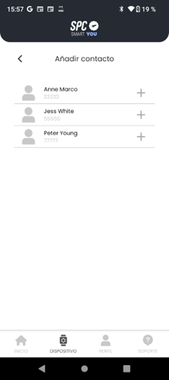 With this functionality, you can add, remove and sort contacts on your wearable. When you press the option, the configured contacts are displayed:
