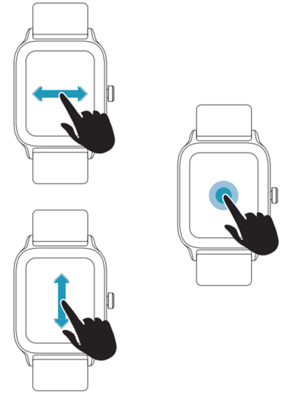 Pour naviguer entre les différents écrans de votre montre, vous pouvez faire glisser votre doigt verticalement, horizontalement et/ou appuyer pour y accéder.