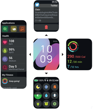 En glissant de droite à gauche, vous trouverez les principales fonctions de l'appareil par défaut. Vous pourrez voir les données résumées de la montre en un coup d'œil.