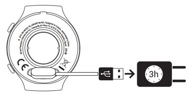 Pour charger la montre, branchez le câble de chargement fourni avec l’appareil à un chargeur USB standard (5 volts) et aux bornes de chargement magnétiques de la montre, comme illustré dans la figure :