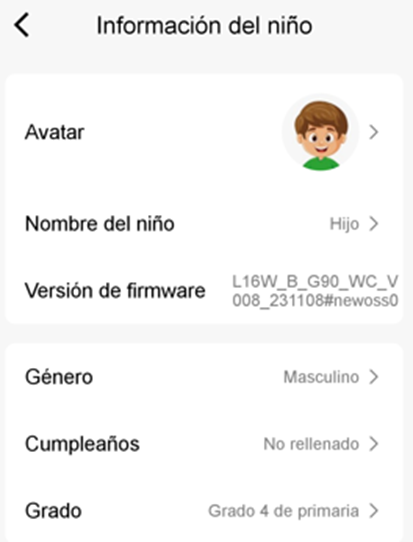 Contient les informations de base de la montre et de l’enfant : nom, photo, IMEI, numéro de téléphone de la montre, code QR de la montre, version du firmware, sexe, date de naissance, niveau scolaire :