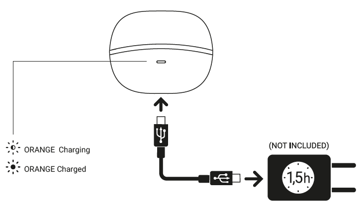 Connecte le câble USB au port de charge USB de l'étui. Une charge complète de l'étui de charge prend une heure et demie. Tu pourras te guider grâce au voyant LED de l'étui pour connaître le niveau de charge disponible à tout moment. Ce voyant cessera de clignoter lorsque la batterie sera complètement chargée.
