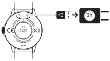 Pour charger votre montre, approchez le connecteur du câble des broches arrière. Les aimants intégrés assurent une connexion correcte. Enfin, branchez l’extrémité USB sur un port de charge.