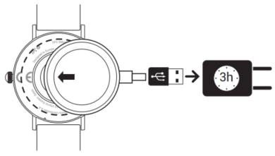 Avant d'allumer ta montre pour la première fois, il est conseillé de charger complètement sa batterie. Pour cela, connecte la base de charge à l'arrière de l'appareil et le connecteur USB à un port de charge USB.