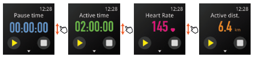 Pendant l'exercice, faites glisser votre doigt vers la droite ou appuyez sur le bouton droit pour faire une pause. Sur la page de pause, faites glisser votre doigt vers le haut ou le bas ou appuyez sur la touche ↓ pour afficher le temps de pause, le temps d'activité, la fréquence cardiaque ou la distance d'activité. Appuyez sur le bouton en haut à gauche pour continuer l'exercice.