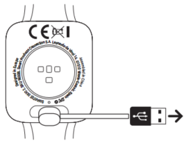 Avant d'allumer votre montre pour la première fois, il est conseillé de charger complètement sa batterie. Pour cela, connectez le câble de chargement à l'arrière de l'appareil et le connecteur USB à un port USB de charge.