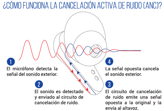 Il circuito responsabile della riduzione del rumore rileva i suoni provenienti dall'esterno tramite i suoi microfoni integrati e invia un segnale di riduzione equivalente, ma opposto, agli auricolari. Generando questo segnale opposto, gli auricolari bloccano gran parte delle fonti di suono esterne.