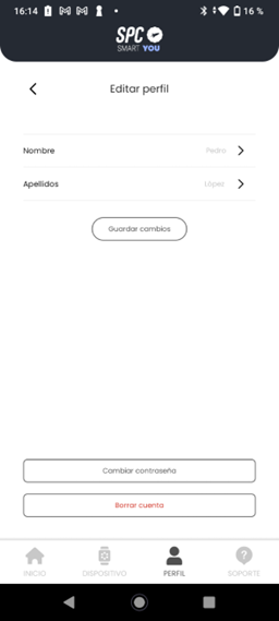 Selezionando l'opzione “Modifica profilo”, puoi cambiare il tuo Nome, Cognome e accedere alle funzioni Cambia password ed Elimina account: