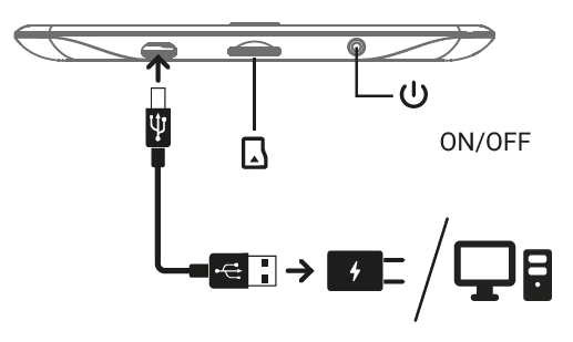 Il tuo DICKENS LIGHT 2 PRO è dotato di batteria interna. Prima di iniziare ad utilizzarlo, dovrai ricaricarlo con un caricabatterie. Ti consigliamo di utilizzare il cavo USB fornito tra gli accessori nella confezione e di collegarlo a un PC o Mac, oppure alla rete elettrica tramite un caricatore USB del tuo cellulare o tablet (non fornito). Non importa se il DICKENS LIGHT 2 PRO è acceso o spento; non appena verrà collegato, lo schermo si accenderà e il processo di ricarica inizierà.