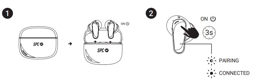 Una volta eseguito l'abbinamento con un dispositivo, gli SPC BOOST BUDS si connetteranno automaticamente quando verranno tolti dall'astuccio di ricarica e il Bluetooth dell'altro dispositivo sarà attivo e nel raggio d'azione.