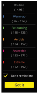 L’orologio mostrerà il colore e il valore della zona di frequenza cardíaca reale prima di iniziare l’esercizio. Tocca su "Non ricordare" perché quest’ informazione non appaia la prossima volta quando si riavvia l’orologio.