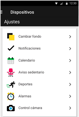 Ricorda che dalla sezione "DISPOSITIVI" del tuo menú laterale, potrai accedere alle opzioni del tuo wearable, sempre e quando questo è collegato all’App. Queste opzioni dipenderano dal modello che hai vincolato, ma tra le altre cose potrai: