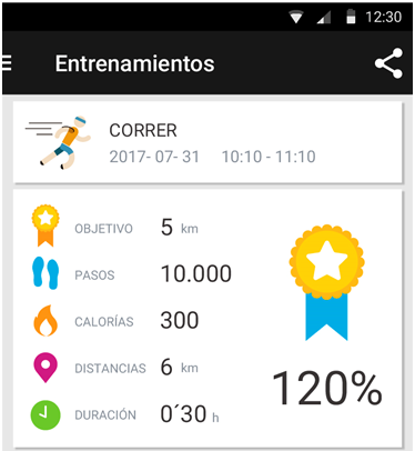 Potrai vedere il sunto dele tue attività, dall’ obiettivoche ti sei prefissato per questo allenamento e se lo hai terminato (se il tuo wearable te lo indica), fino ai passi, ale distanze, alle calorie, e ai tempi che hai invertito per raggiungerlo.