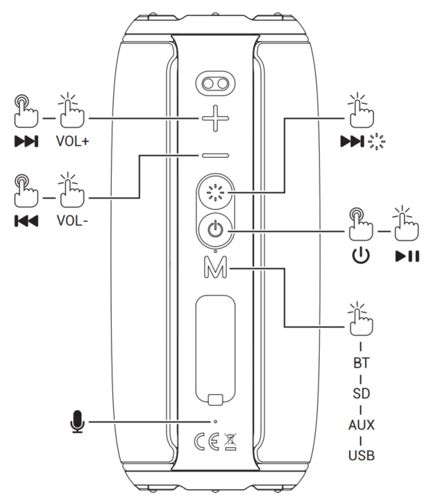 - Pulsante Modalità. Pressione breve per passare dalla modalità BT a SD, USB o AUX.