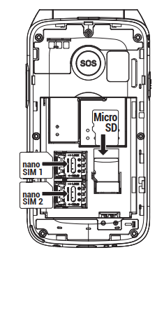 Inserire la/le scheda/e SIM (formato MiniSIM nella versione V1, NanoSIM nella versione V2) nella posizione indicata, facendo combaciare i contatti dorati del telefono e della/delle scheda/e.