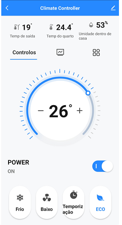 - Na app: No painel de controlo, no lado inferior direito tens um botão “POWER” para ligar e desligar o dispositivo.
