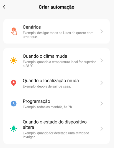 Neste ecrã, no lado superior direito, encontras o botão “+”, primes em cima dele e aparecerão as opções de automatização.