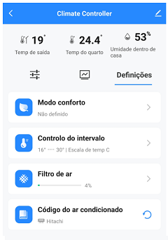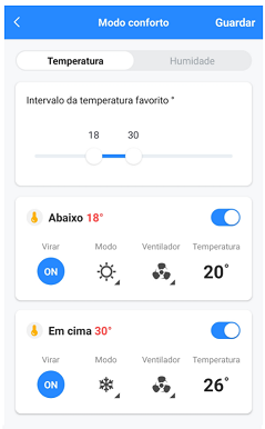 Aqui estabeleces a temperatura e/ou humidade mín/máx para que o dispositivo se ative automaticamente com os valores estabelecidos.