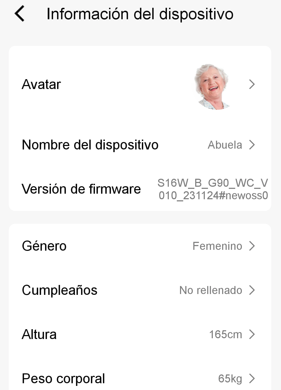 Contém a informação básica do relógio e informação do Senior: Nome, foto, IMEI, número de telefone do relógio, Código QR do relógio, versão do firmware, Gênero, Aniversário, Altura e Peso corporal: