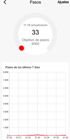 O objetivo de passos diários por padrão é de 8.000 (número diário recomendado por várias organizações de saúde). Ao clicar na parte superior em Configurações, aparecerá uma barra seletora que permitirá variar esse número para outro valor desejado: