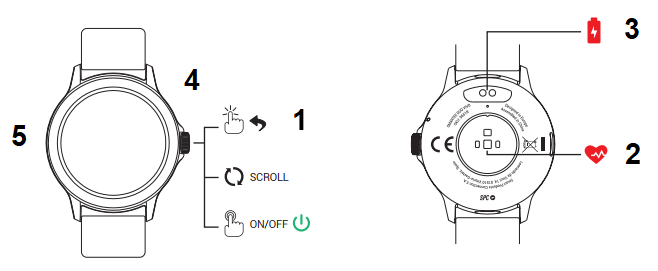 A pressão prolongada liga e desliga o relógio. Uma vez ligado, a pressão breve liga ou desliga o ecrã. Dentro de um menu, pressione-o brevemente para sair do menu e voltar ao ecrã inicial, ou para pausar/reiniciar o desporto que está a realizar. Também tem uma função rotativa, para poder mover-se verticalmente (scroll) dentro dos diferentes menus.
