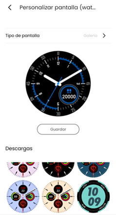 - Galeria: São ecrãs adicionais, descarregáveis da nossa galeria. Os disponíveis aparecem no quadro inferior; clique no que deseja e, em seguida, selecione “Guardar”. Um processo de download será iniciado, indicado por uma mensagem no relógio; deve aguardar até que termine.