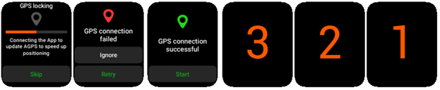 Para desportos ao ar livre, o GPS será utilizado para traçar o percurso. Um ecrã indicará que precisa de aguardar até que o posicionamento seja adquirido. Se não estiver interessado nas informações do percurso, pode ignorar esta etapa pressionando a opção Saltar. O relógio pode detetar posicionamento GNSS a partir dos satélites GPS, Galileo, GLONASS e Beidou. Além disso, pode adquirir os dados do satélite mais rapidamente através da ligação à aplicação móvel, se disponível.