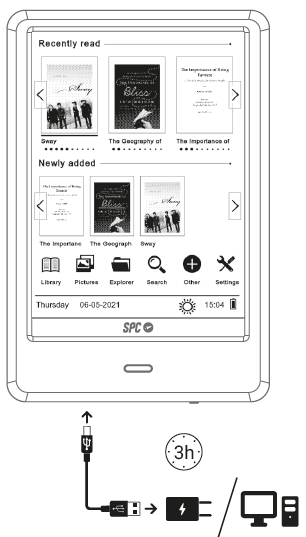 O seu DICKENS LIGHT 2 PRO dispõe de bateria interna. Antes de começar a usá-lo, terá de o carregar através de um carregador. Para isto, recomendamos que utilize o cabo USB que se encontra entre os acessórios fornecidos na caixa e que o ligue a um PC ou Mac, ou à rede elétrica através de um carregador USB do seu telemóvel ou tablet (não fornecido). Não importa se o DICKENS LIGHT 2 PRO está ligado ou desligado, assim que for ligado, o ecrã acenderá e o processo de carga terá início.