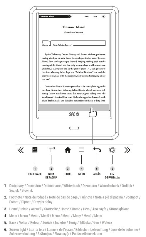 - T2: Notas de rodapé. Mostra as notas da página atual. Ao tocar em T2 entras neste modo e o ícone aparece na parte superior. Toca no número da nota para a visualizar. Toca em Voltar para regressar à leitura ou novamente em T2 para sair deste modo.