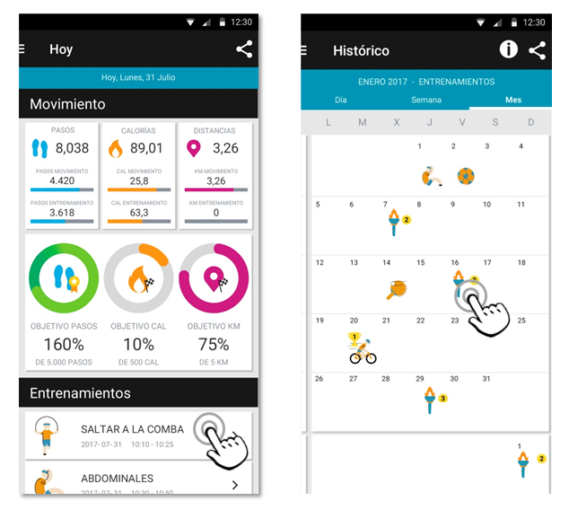 Cada vez que consulta os detalhes de um treino, Smartee proporciona-lhe toda a informação sobre a sessão. Poderá aceder ao desporto a partir da janela HOJE ou a partir do HISTÓRICO.