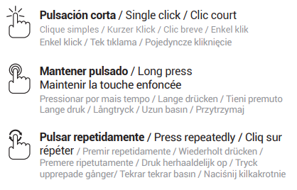 Nas figuras seguintes, estes símbolos são utilizados para os diferentes tipos de pressão de tecla: